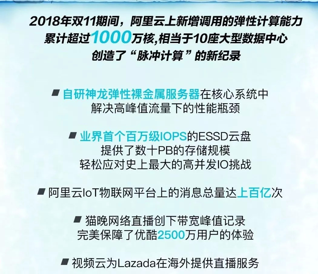 据阿里云统计,今年双11期间,阿里云上新增调用的弹性计算能力累计超过1000万核,相当于10座大型数据中心创造了“脉冲计算”的新纪录。