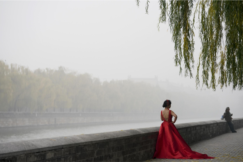 2018年11月14日,北京空气遭遇重度污染。图为故宫角楼旁拍摄婚纱照的新人。