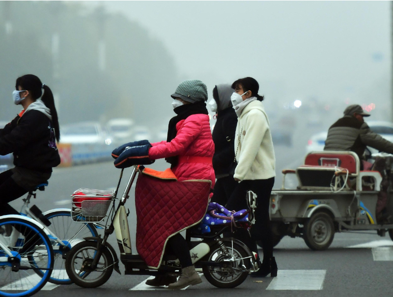 河北多地遭遇雾霾侵袭。图为石家庄市民“捂装”出行。