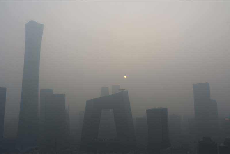 北京朝阳区CBD核心区,央视新址大楼、中国尊等标志建筑已处于雾霾中。