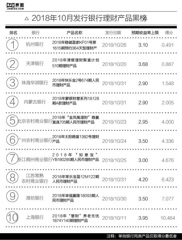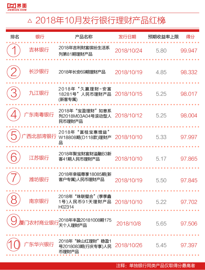 每个月,界面新闻会根据自己制作的一个涵盖数万只理财产品的数据库,对当月理财产品进行评估与排行。该数据库在衡量当期宏观经济、行业水平、银行自身风险、产品属性后选出性价比最高和最低的产品,其挑选范围是全行发售的信息披露充分的非结构类理财产品,最终形成当月产品红黑榜。