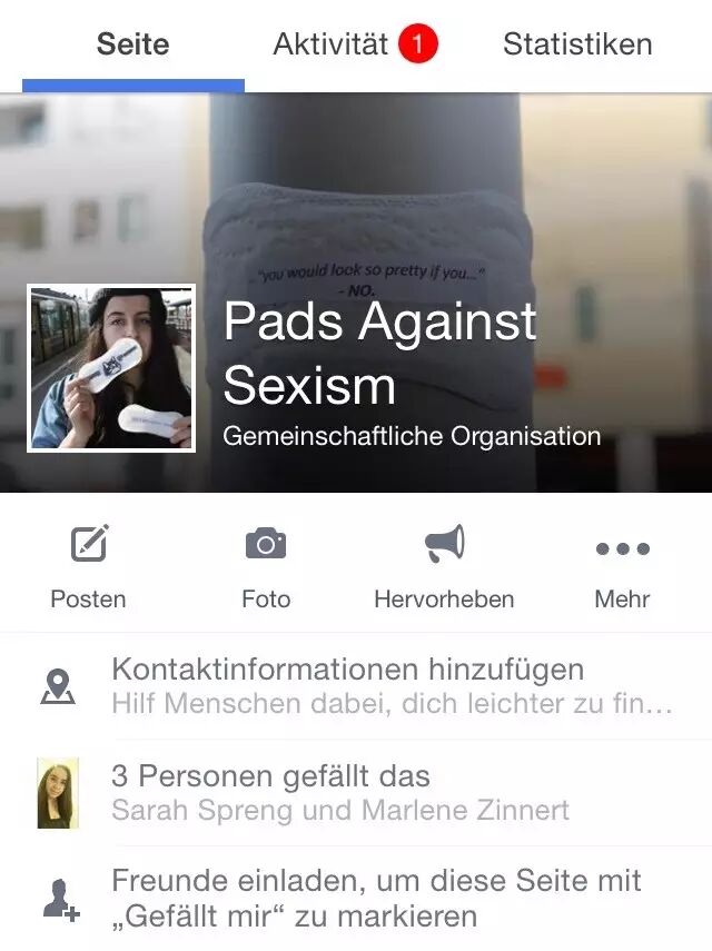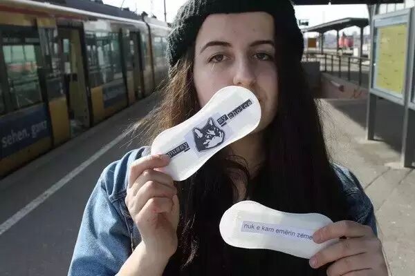 最近,德国女生Elone把写着女性平权字眼的卫生巾贴到街上,这看上去就像电线杠、地铁、公共电梯来了大姨妈。Elone说她的灵感来自是推特上一名女权主义者的话:imagine if men were disgusted with rape as they are with periods.