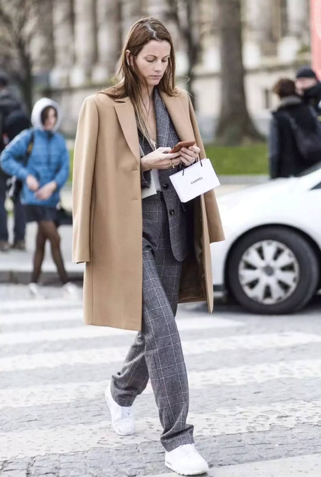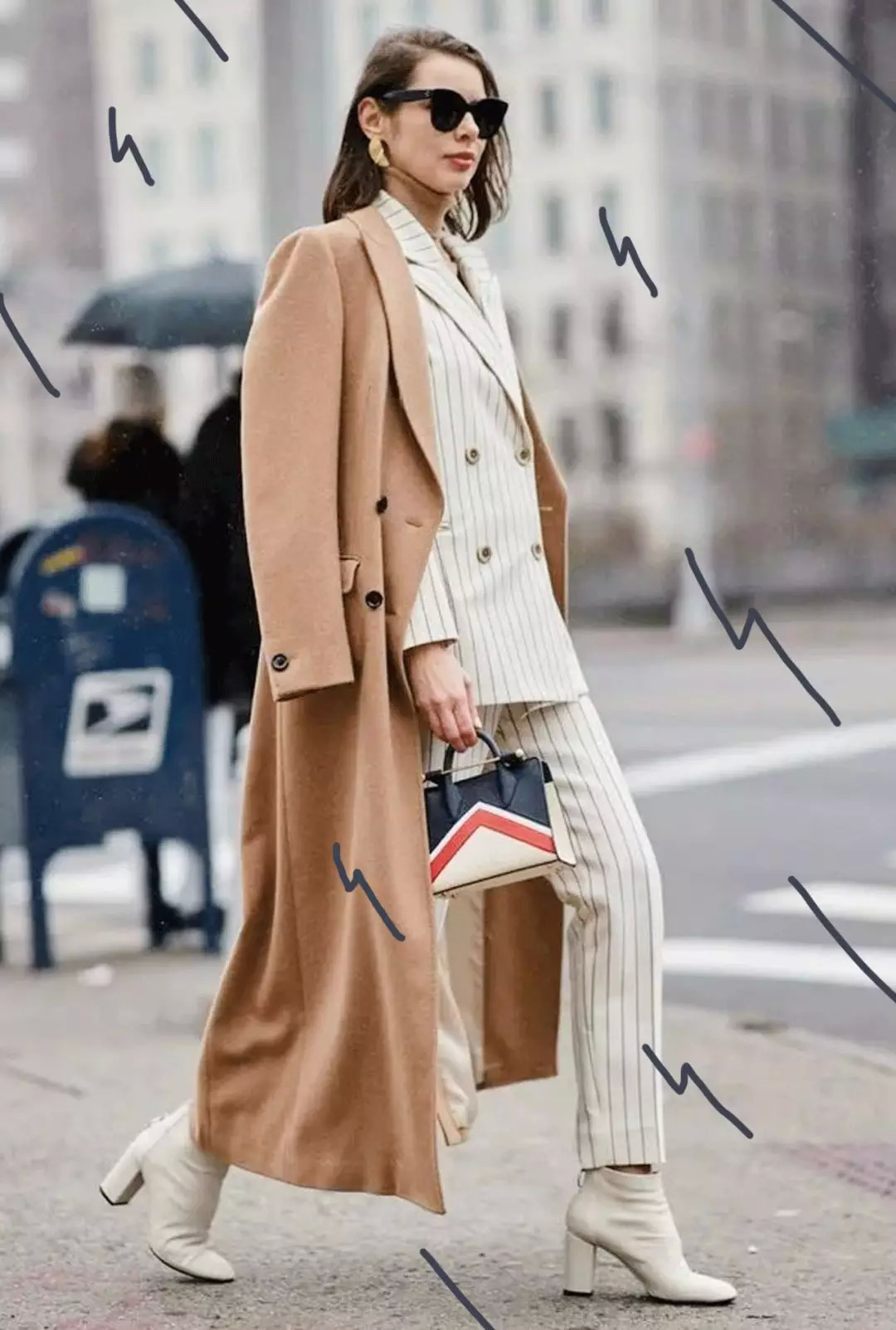 西装的风从去年刮到了今年。其实把驼色大衣叠穿在西装套装外,今年也蛮流行的。