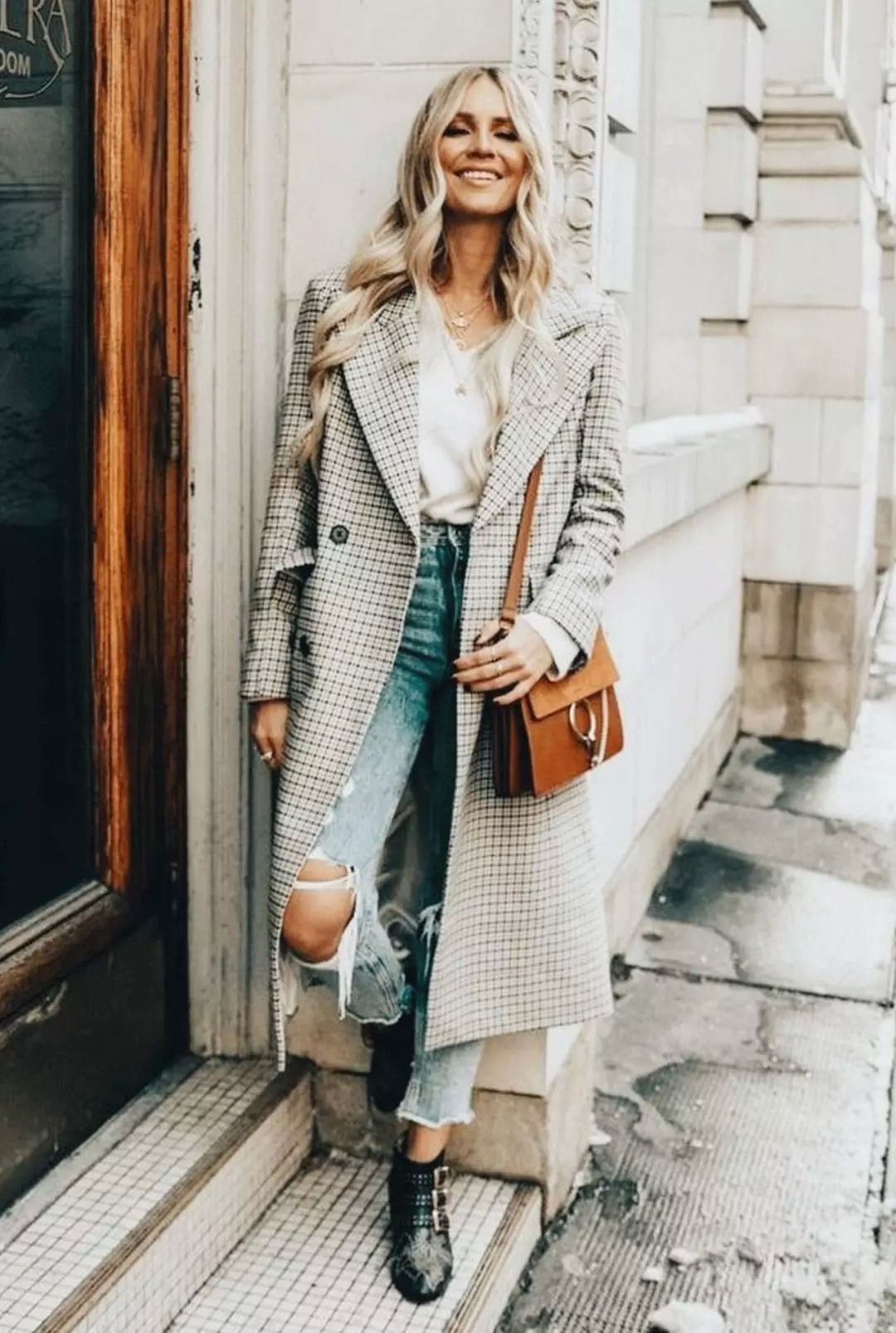 添加了点小颜色的格纹大衣,搭配白上衣、浅色的牛仔裤,很清爽青春。
