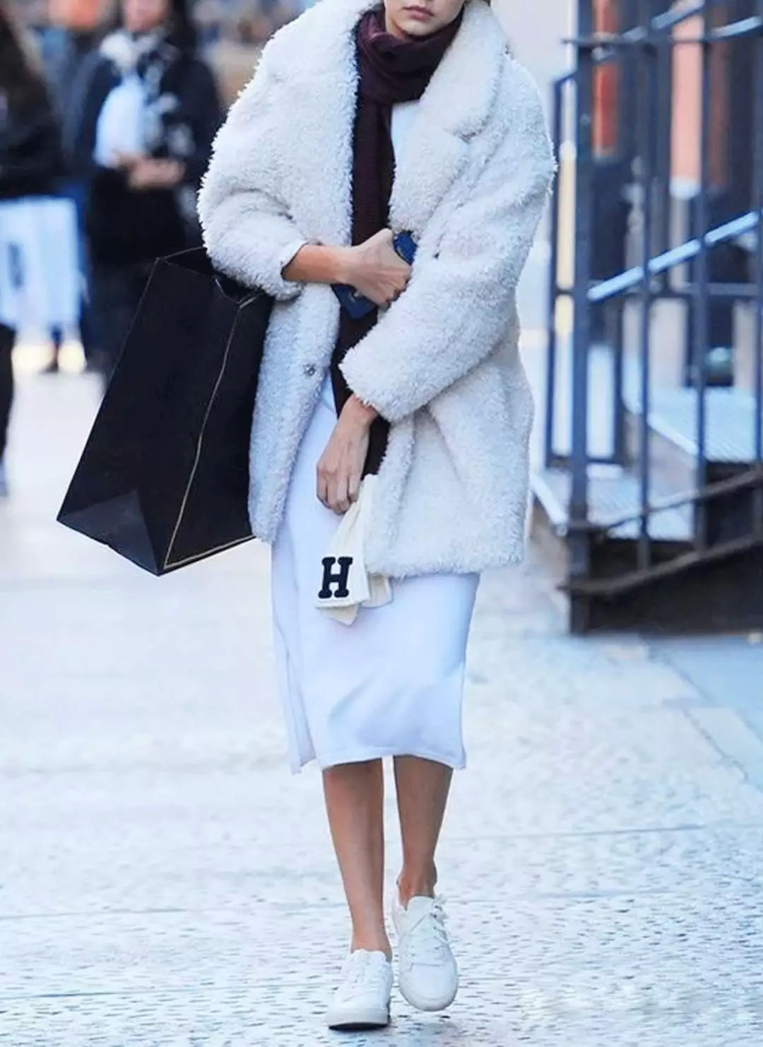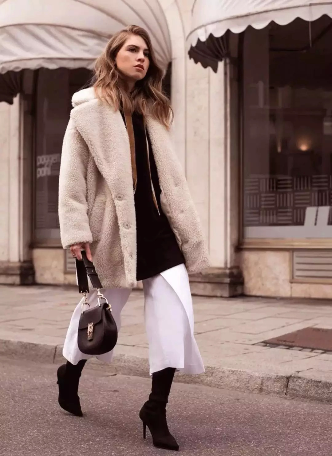 羊羔绒大衣还很适合搭配裙装,露出腿部,感觉人会娇小一圈,而且会显得腿细很多!