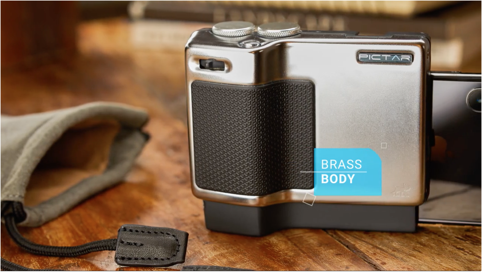 握柄整体采用黄铜铸造,前面把持的皮质防滑部分还采用了鲨鱼鳍设计,十分有专业相机的质感,看一眼仿佛就闻到了烧钱的味道。