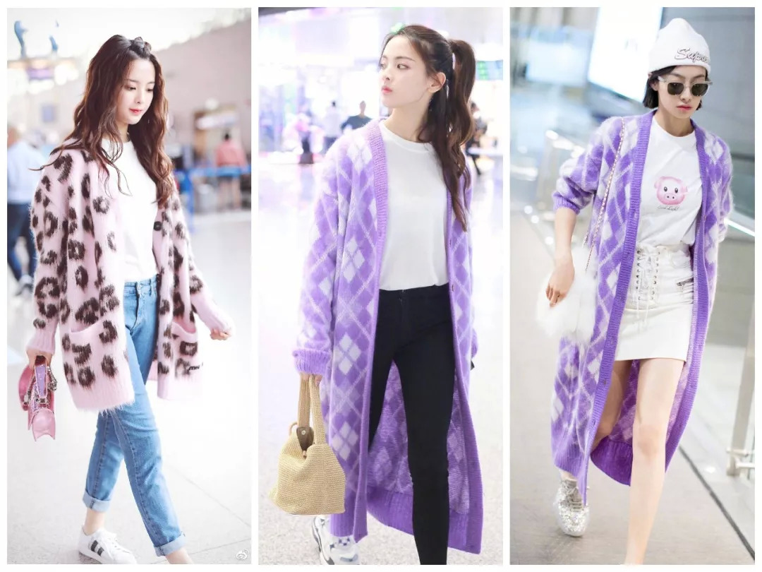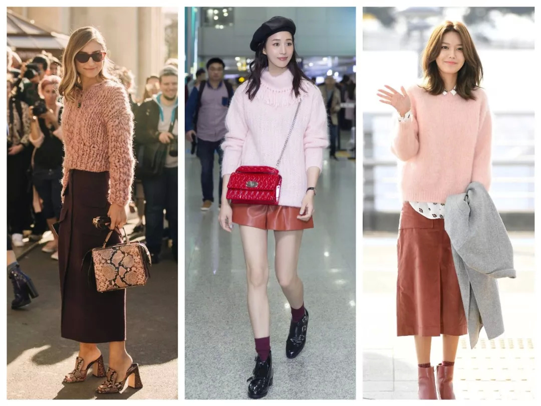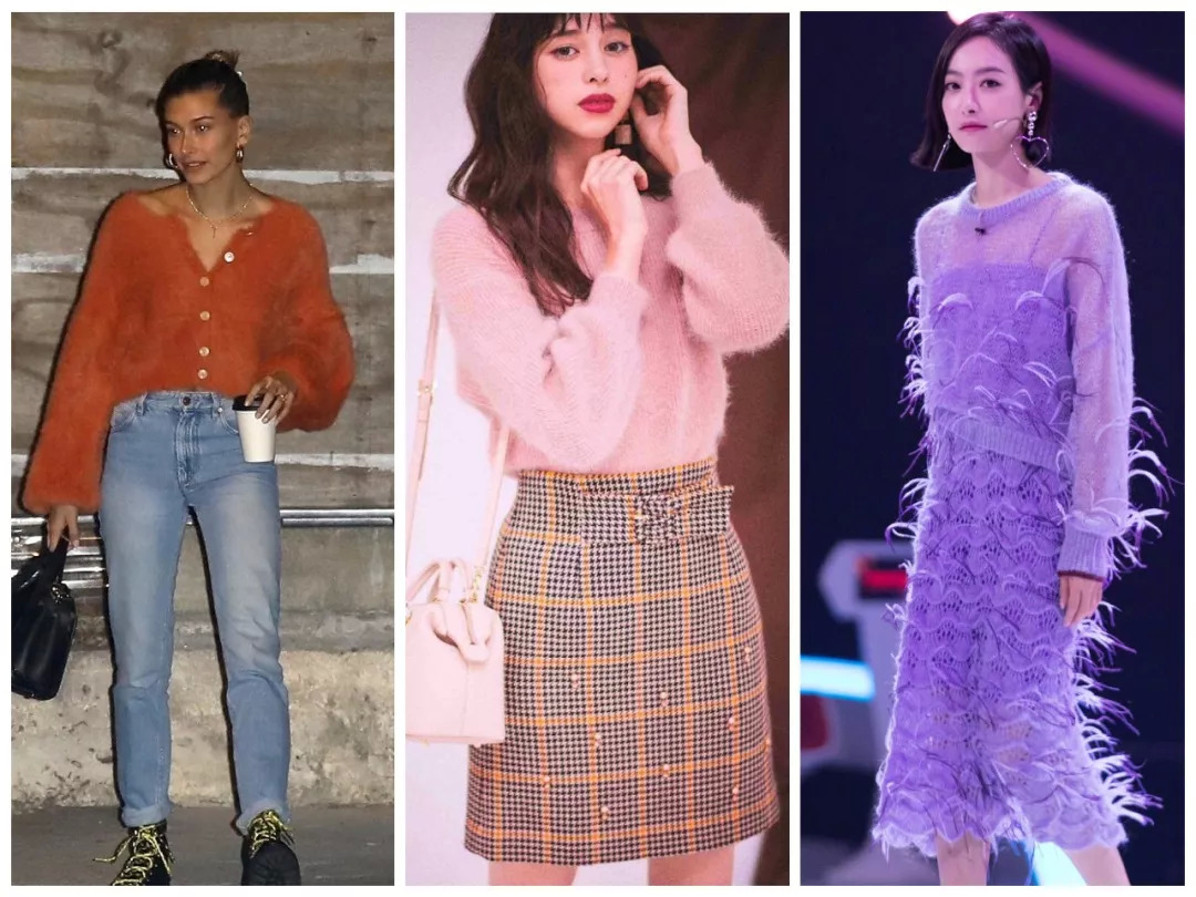 今年彩色毛衣特别火,连带着绒绒毛衣也是各种嗲到不行的色彩。比如海狸的橘色,中条彩未的粉色,还有宋茜的紫色。