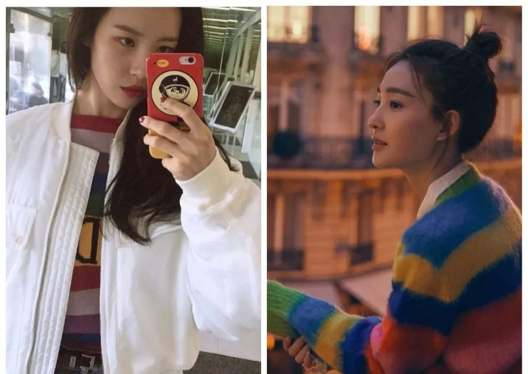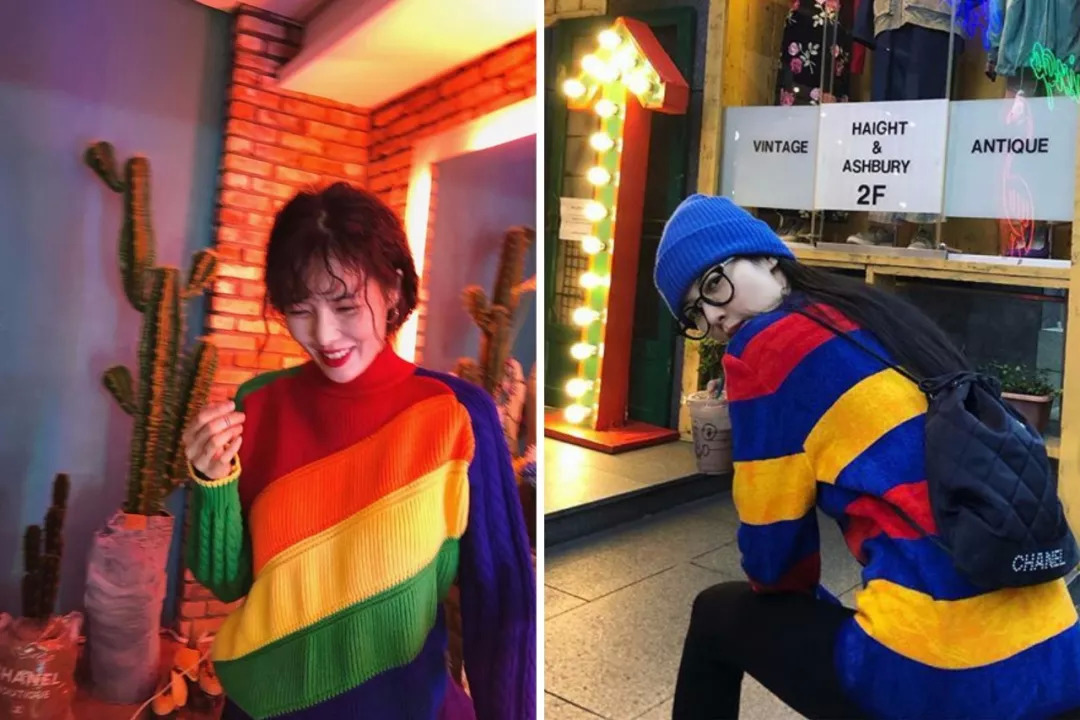 彩色条纹延续去年的彩虹毛衣一路过关斩将,从去年火到今年,可见它有多好穿!比如宣美、王丽坤都穿过。