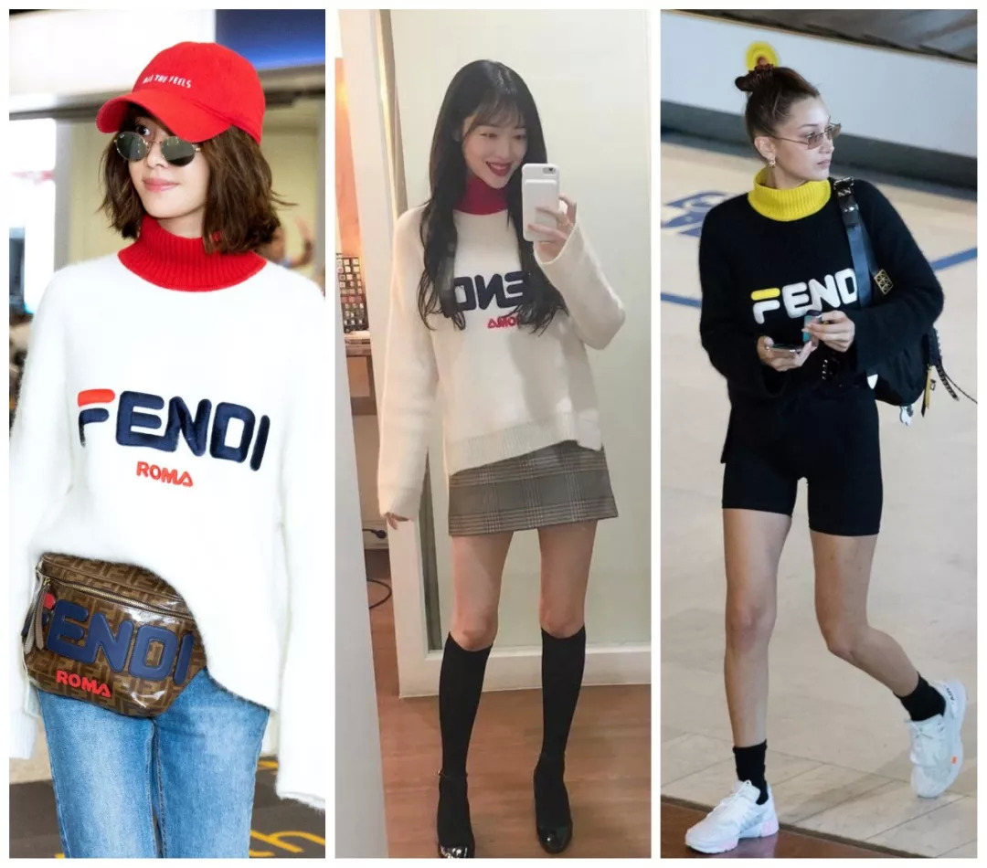 材质厚一些的毛衣,单穿就很时髦,比如蔡依林 、雪莉和Bella穿的Fendi毛衣!