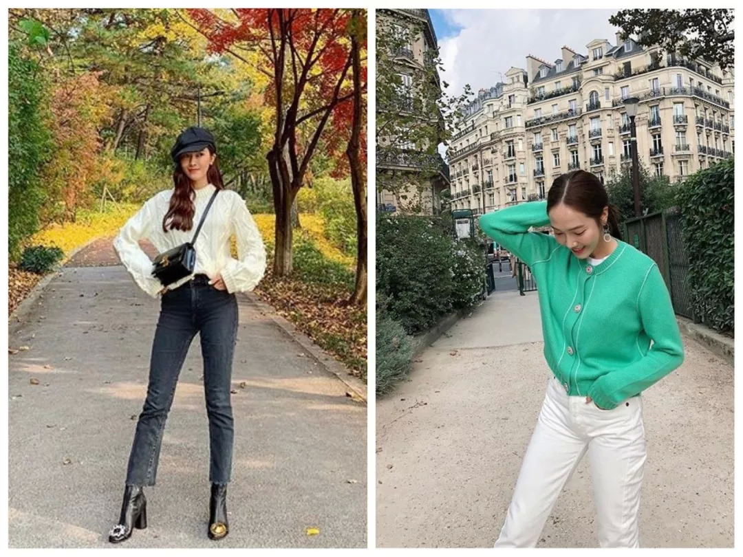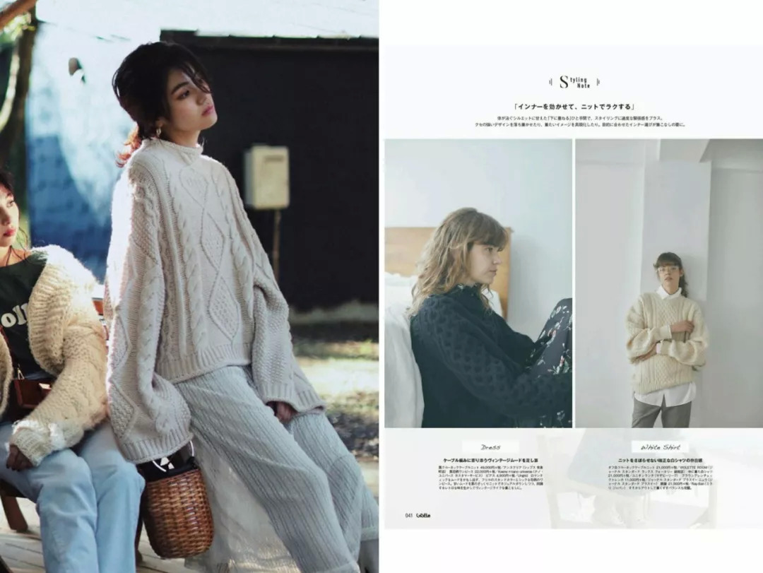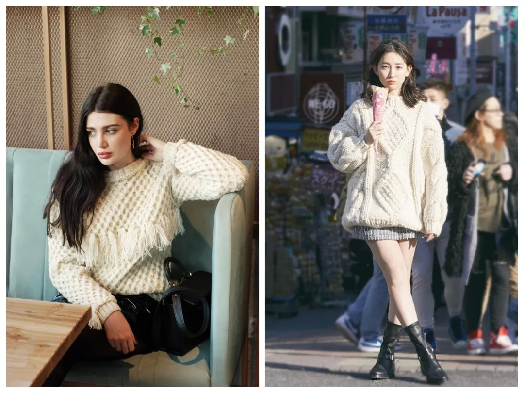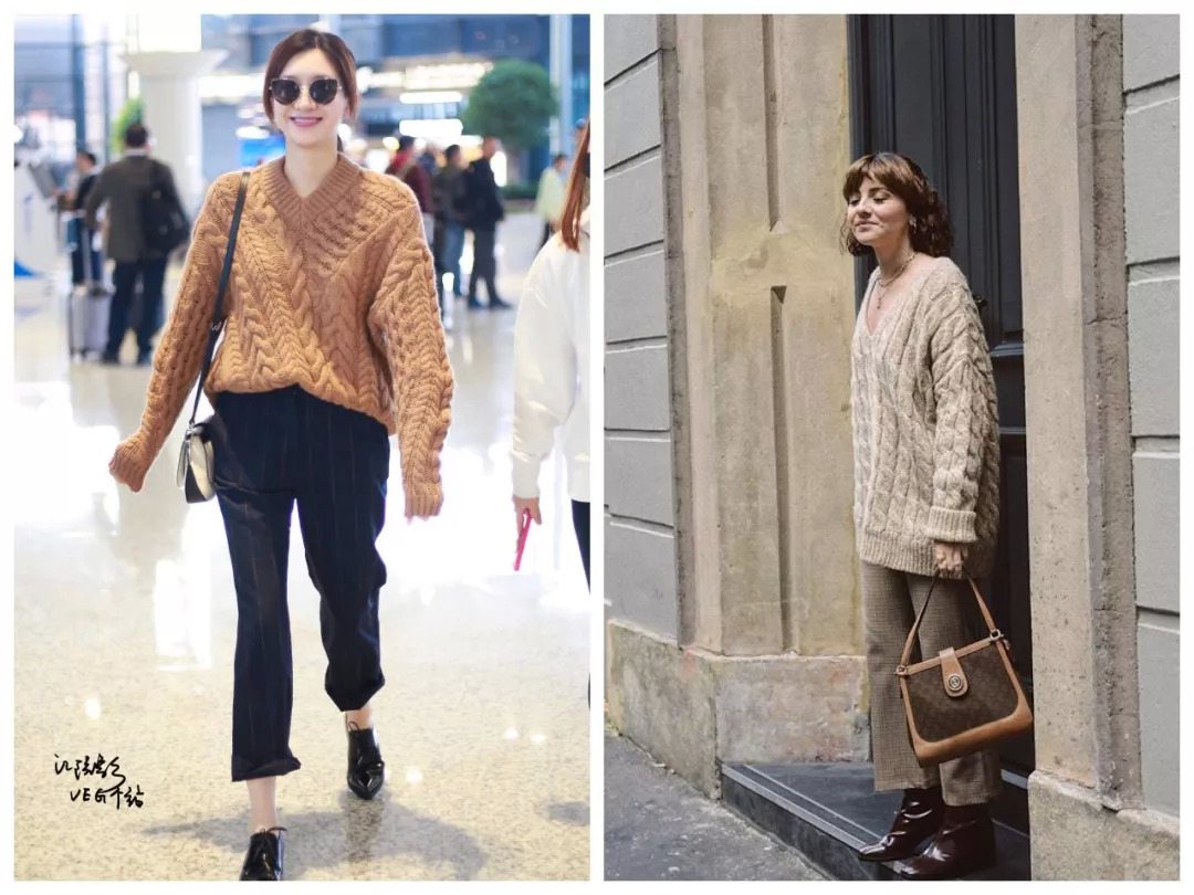 最经典的绞花毛衣是白色的,像小宋佳和小泉里子这样,配阔腿裤或修身牛仔都ok,可温柔可强势。
