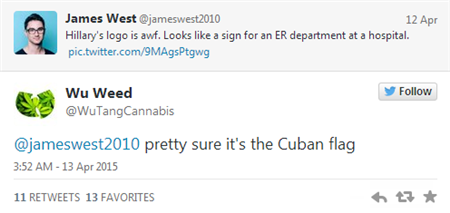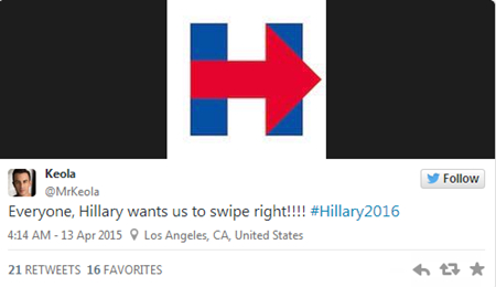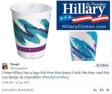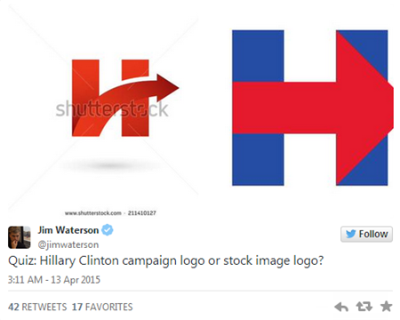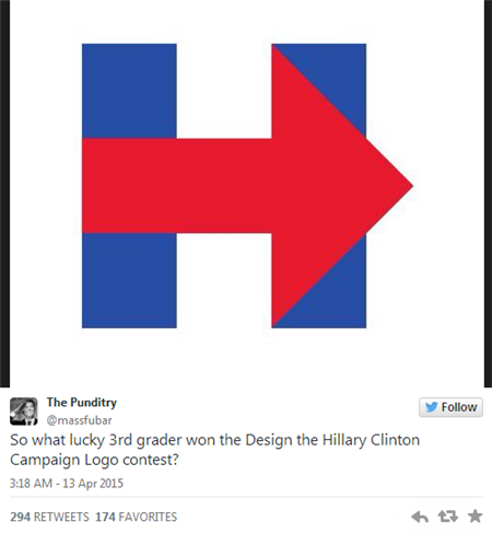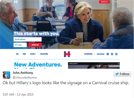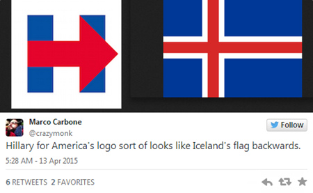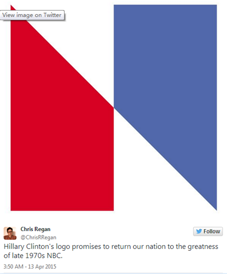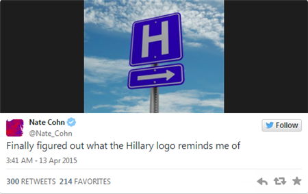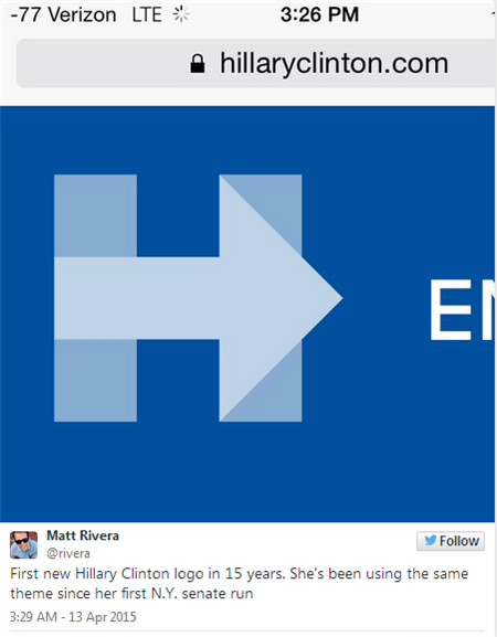 4月12日,希拉里宣布将参加2016年美国总统大选,这是她第二次向美国总统宝座发起进攻。消息一出,人们又发现了槽点。希拉里的竞选logo,也就是那个蓝色“H”加上一个红色向右箭头的标志,总觉得很眼熟。