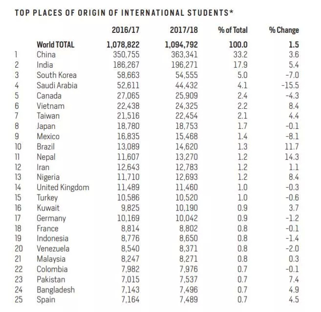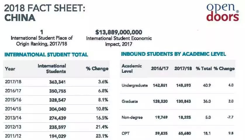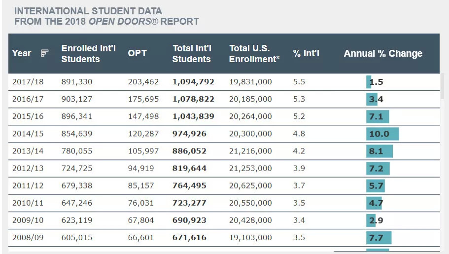 美国国际教育协会(Institute of international education)发布了2018年度《门户开放报告》(《New OpenDoors Data》),对2018年全美教育门户数据做了全面统计。