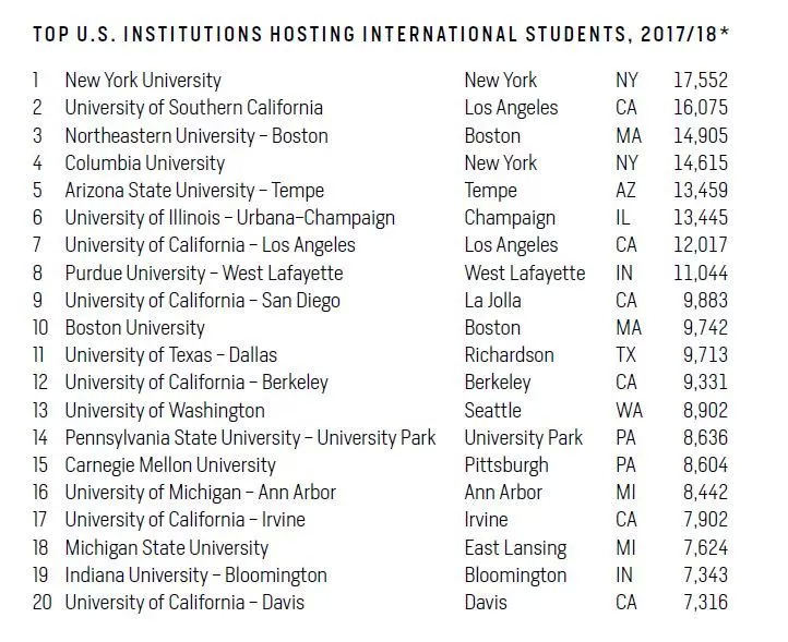 数据显示,国际学生数量最多的十所美国大学分别为:纽约大学、南加州大学、东北大学、哥伦比亚大学、亚利桑那州立大学、伊利诺伊大学香槟分校、加州大学洛杉矶分校、普渡大学、加州大学圣地亚哥分校、波士顿大学。