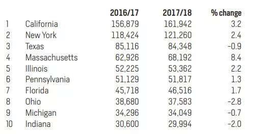 2018年报告还公布了最受留学生欢迎的州:加州、纽约州、德克萨斯州、马萨诸塞州、伊利诺伊州、宾夕法尼亚州、佛罗里达州、俄亥俄州、密歇根州和印第安纳州。