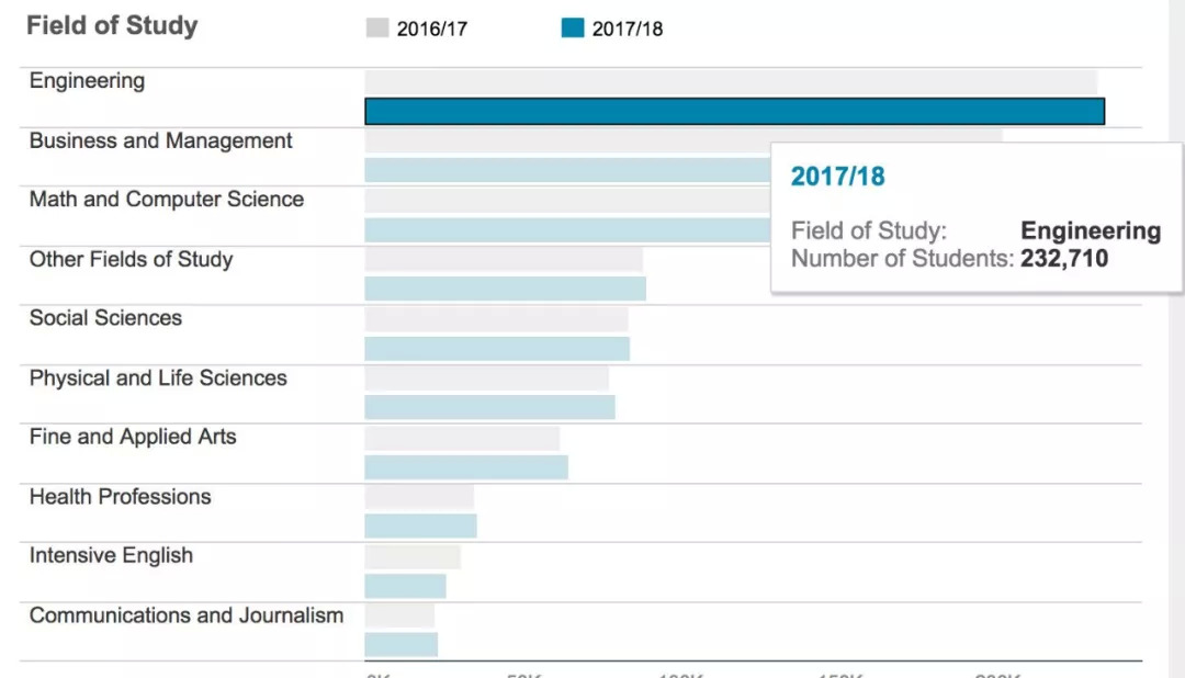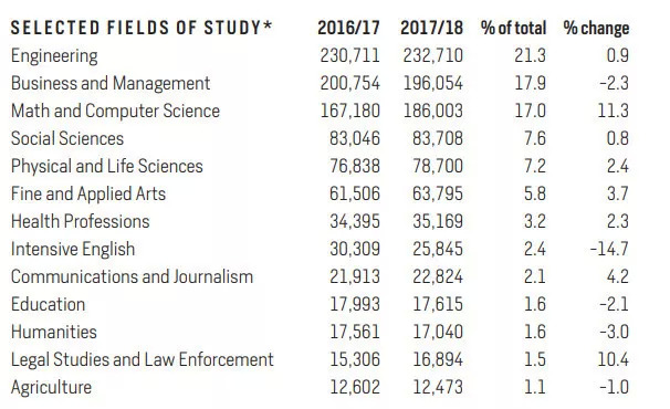 STEM依然是热门专业,工程专业为232710,占据总人数的21.3%,较上一学年增加0.9%。