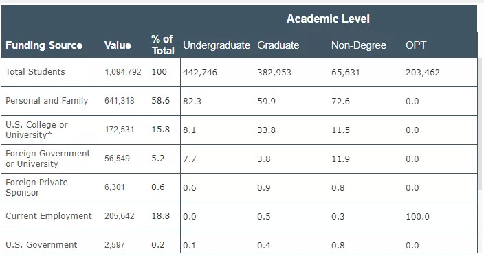 除此之外,在留学费用支出报告中,58.6%的留学生学费来源为个人及家庭负担,15.8%的来源为美国高等学校,5.2%的来源为非美国政府及大学,18.8%的来源为现有雇主。