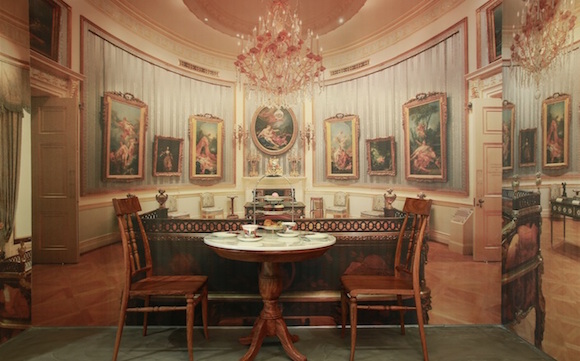 毗邻Vivienne Westwood门店,这家咖啡店入门右侧是以英式传统茶罐装饰的开放式厨房。整间Café主要分成两个不同主题的区域,以时装秀后台风光为题的“摄影棚”,以及充满18世纪法国风情的“茶室”。“摄影棚”区域中,白色的背景纸从墙面延展至用餐区的地板;在“茶室”设计上则运用了其时装作品中经常出现的错视手法(Trompe l'oeil),华丽的水晶吊灯和壁纸给人一种身处18世纪法国宫廷的感觉。