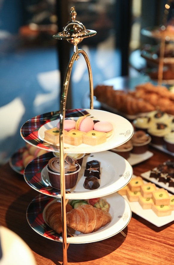 Vivienne Westwood品牌签名式的土星环标志和格子图案无处不在,你便会在瓷盘和茶盘架上发现它们的踪迹,就连下午茶中的蛋糕也打着土星环的标志。