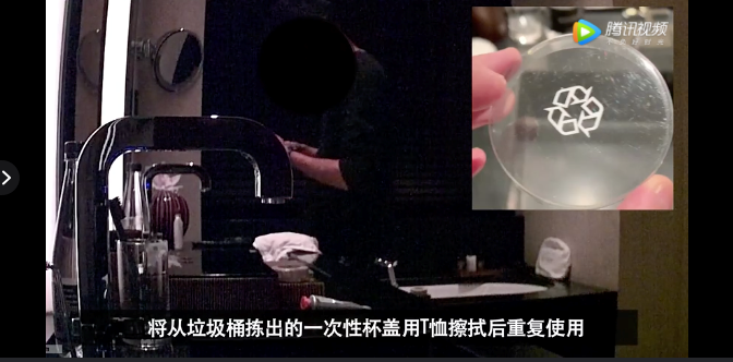 上海宝格丽酒店(城景房参考房价:4500元/晚),服务员从垃圾桶里回收一次性的塑料杯盖用自己的T恤擦一下重复使用,用客人擦过脸的小方巾擦杯子和洗手台;