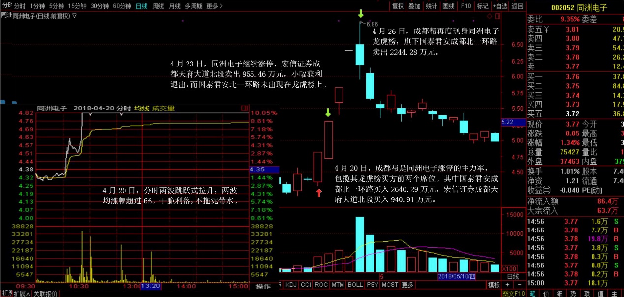 接下来的两个交易日同洲电子继续封板,其中24日没有龙虎榜数据,25日成都帮旗下没有席位上榜。直至4月26日,成都帮再度现身同洲电子龙虎榜,旗下国泰君安成都北一环路卖出2244.28万元,同时买入76.95万元。