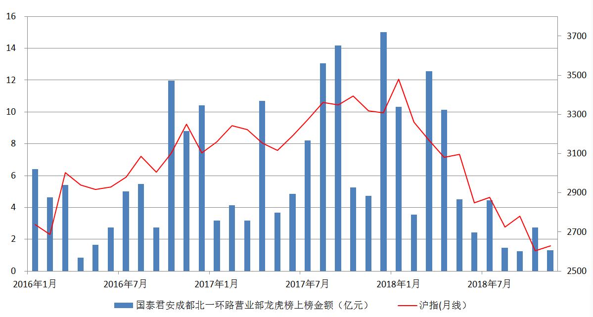 上榜金额方面也显示出了类似特征,界面新闻以其核心营业部之一的国泰君安成都北一环路营业部为例对比了其自2016年以来月度上榜金额与同期沪指表现的情况。