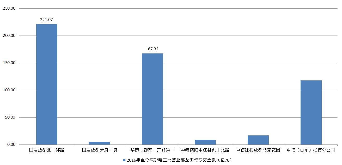 界面新闻统计了2016年以来成都帮旗下几个营业部龙虎榜上成交金额的情况,国泰君安证券成都北一环路营业部和华泰证券成都南一环路第二营业部的上榜金额以绝对优势稳居前两位,另外,中信证券淄博分公司上榜的金额列第三位。