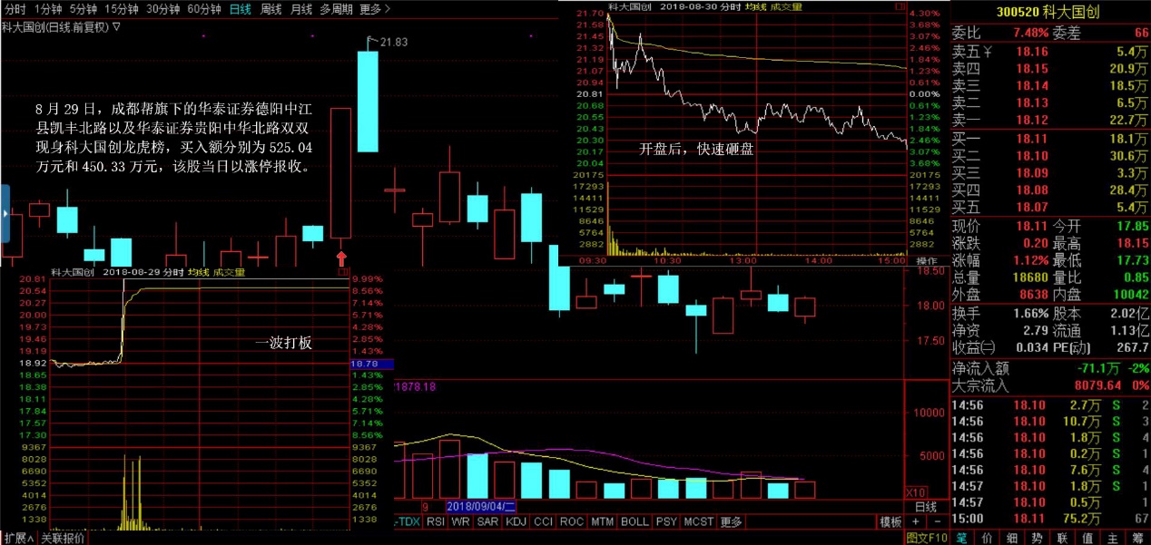 开盘啦数据显示,8月29日,成都帮旗下的两个营业部华泰证券德阳中江县凯丰北路以及华泰证券贵阳中华北路双双出现在科大国创龙虎榜买三和买四的位置,买入额分别为525.04万元和450.33万元,该股当日以涨停报收。次日,科大国创股价冲高回落,最终收跌2.98%。