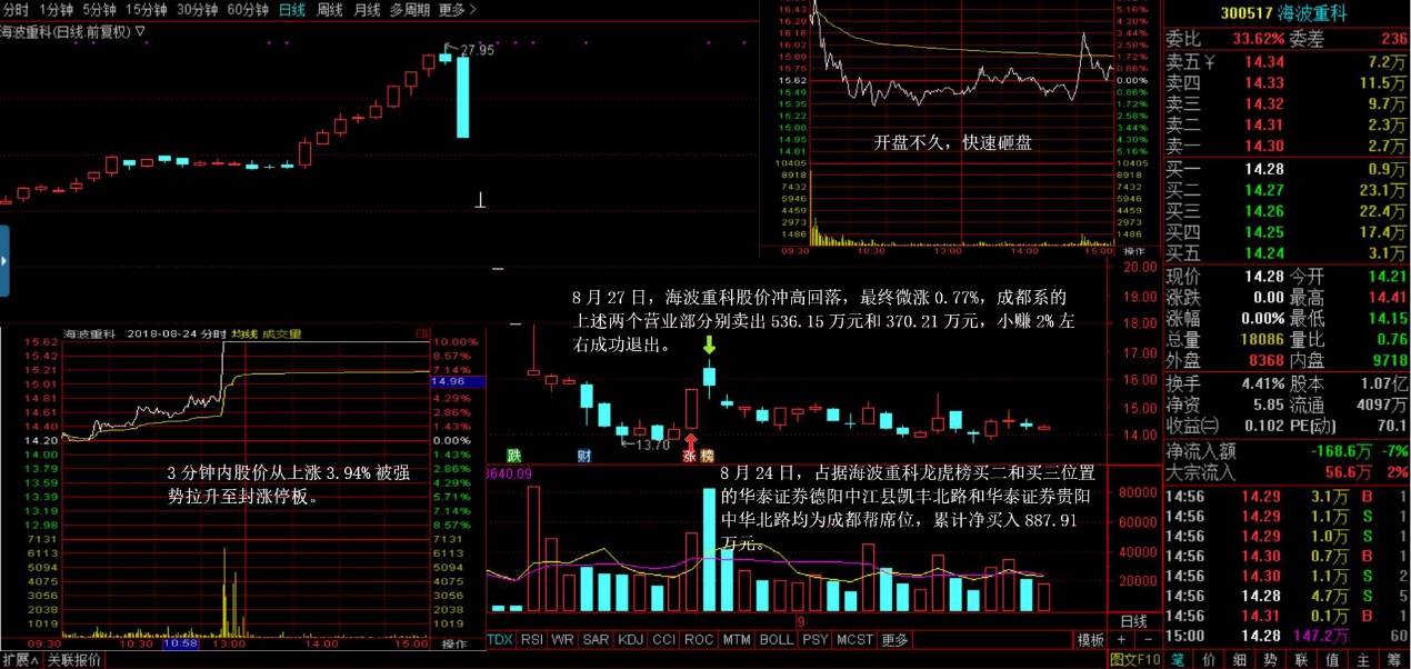 8月24日,成都帮开始抄底海波重科。开盘啦数据显示,其旗下的华泰证券德阳中江县凯丰北路和华泰证券贵阳中华北路两个营业部分别占据该股当日龙虎榜买二和买三的位置,累计净买入887.91万元。分时图上看,海波重科在当日11:11-11:14仅仅3分钟内股价从上涨3.94%被强势拉升至涨停并成功封板至收盘。
