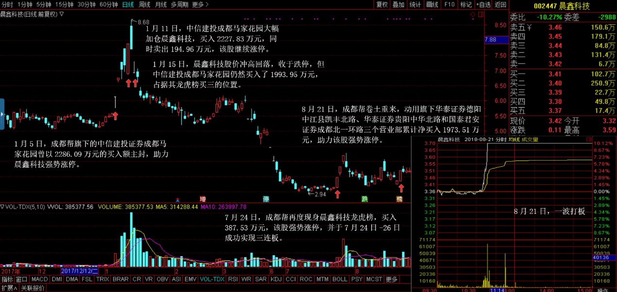 此后,晨鑫科技股大幅回调,但期间仍被多次爆炒。7月24日,成都帮再度现身晨鑫科技龙虎榜,买入387.53万元,该股强势涨停,并成功实现三连板。
