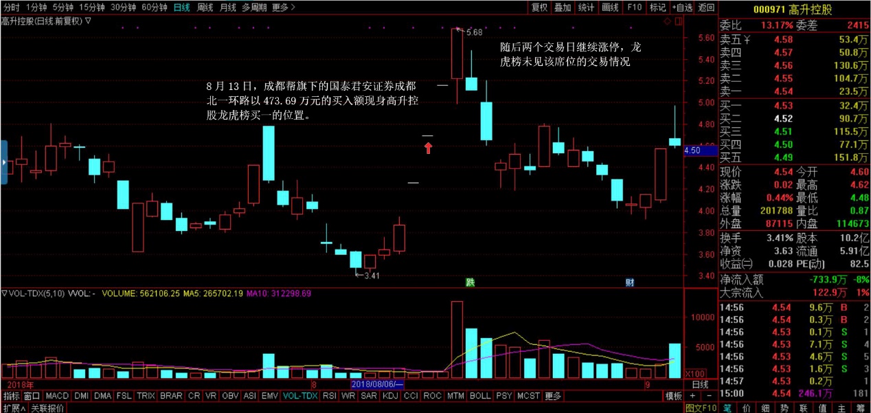 受益于此,8月10日,高升控股一字涨停,下一个交易日(8月13日)继续一字板。龙虎榜数据显示,当日成都帮旗下的国泰君安证券成都北一环路以473.69万元买入额占据该股龙虎榜买一位置。
