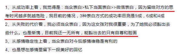 楼主追求一个妹子有段时间了,“自我感觉顺利”,没正式表白过,“一直以其他方式表达着自己的感情”,便想当众表白,还分析了此举的优点。