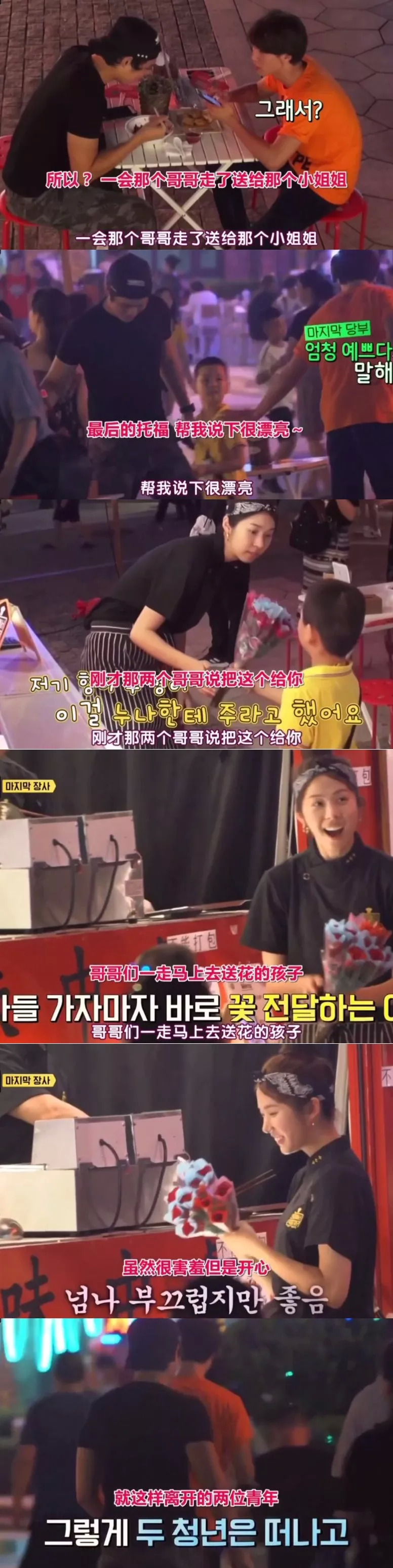 黑衣男为了帮助朋友,偷偷找来了一个卖花的小孩,让小孩在他们离开之后把花送给小姐姐,顺便附上电话号码。
