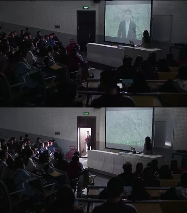 和女主角关系暧昧的大学学长,替换了女生发表课题时演讲用的PPT,放了一段告白VCR,再出现在教室里当众表白。
