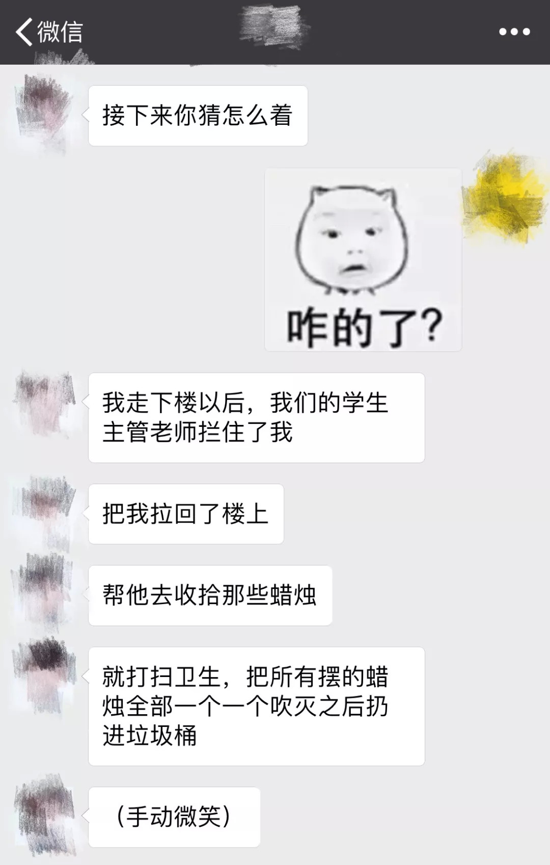 那天我刚吃完饭回宿舍,就被一个女生拖出去,也没有告诉我什么事情,把我带到了另外一栋楼的楼顶。结果呢,打开门就看见一个男生背后一片烛光。那个男生就当着帮他摆蜡烛的这些人面前说:我喜欢你,能不能跟我在一起。我当时想都没想就直接拒绝了。