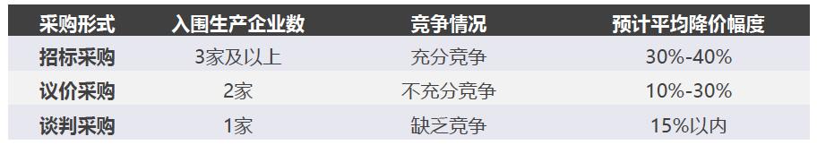 鲸准研究院报告认为,带量采购将使得原研企业面临降价风险,而入围试点方案的品种从短期来看,降价幅度有限。此外,由于医院采购由医保局监督完成,企业销售费用可以相对缩减。同时,入围的生产企业数量的不同也会导致采购方式、竞争程度、降价幅度有所不同。