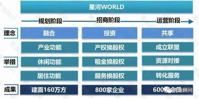 星河WORLD在招商过程中,采取“高富帅房东+小而美股东”的模式对目标客户分层,再通过创客空间、孵化器、加速器、总部基地对办公产品分类,打通企业成长链条,从实力雄厚的大企业获取租金收益,从具备发展前景的成长型企业分享投资退出收益,并在投资800多家企业的过程中,采取“产权换股权、租金换股权、服务换股权”的方式降低现金支出压力。