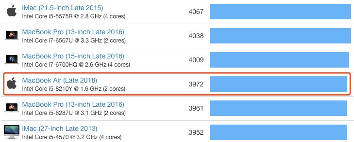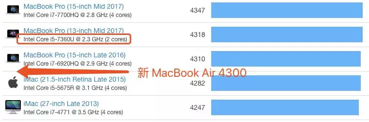 因为考虑到新 MacBook Air 是双核的 CPU,所以可以大致预估一下它的性能和 2017 款 13 寸 MacBook Pro 的双核 i5-7360U 差不多。跟托尼之前说过的一样,这里面除了苹果的调教,还有散热风扇的功劳。