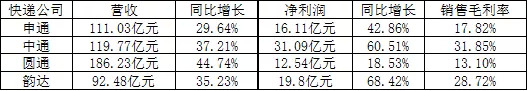 中通快递首席财务官颜惠萍也认为,三季度公司净利润的增长主要得益于规模效益扩大、运营效率提升。她表示,中通的单票运输分拣成本同比下降了9分,由此抵消部分由于竞争产生的单票价格下浮以及油价和人力成本上升等影响;核心快递业务毛利率为33.4%,同比毛利率下降的幅度控制在3个百分点以内;销售及一般管理费用占收入的比重由去年同期的6.2%下降至5.9%,充分体现了公司良好的管理规模效应。