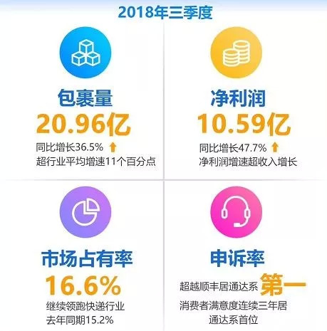 11月15日,中通快递公布2018年三季度财报,其业务量、营收、利润等指标同比大增。三季度业务量达到20.96亿件,较去年同期15.36亿件增长36.5%。