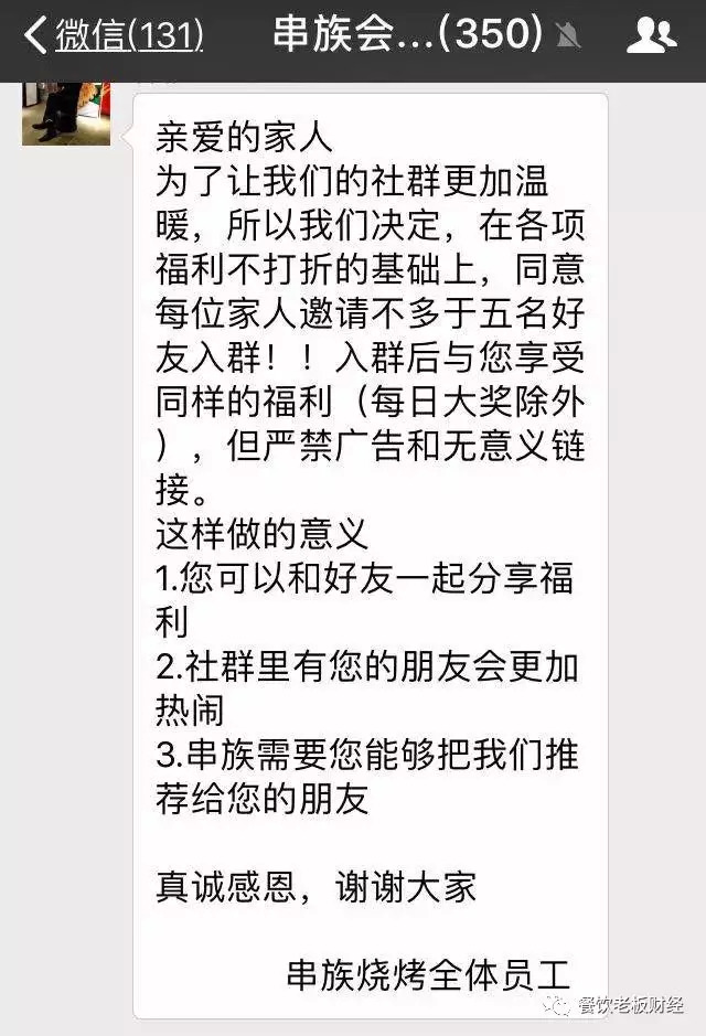 有位餐饮老板告诉财经君餐饮老板财经 (ID:cylbcjcom)说,“老客户都加了微信群的,已经加到第五个群了,经常会在群里给老顾客发发红包,钱虽然不多,就是图个热闹。”微信群成为与食客沟通的渠道,群里会发布一些优惠信息和新菜品,热闹得很。