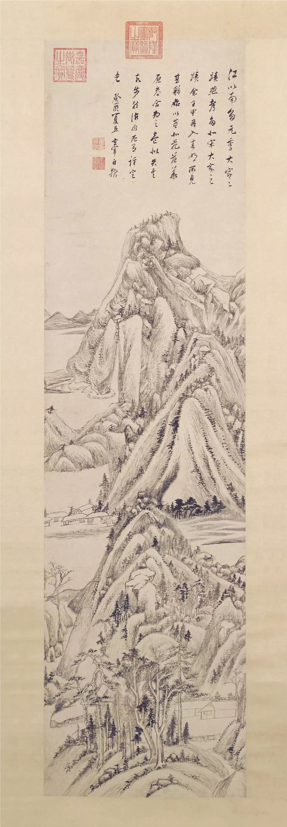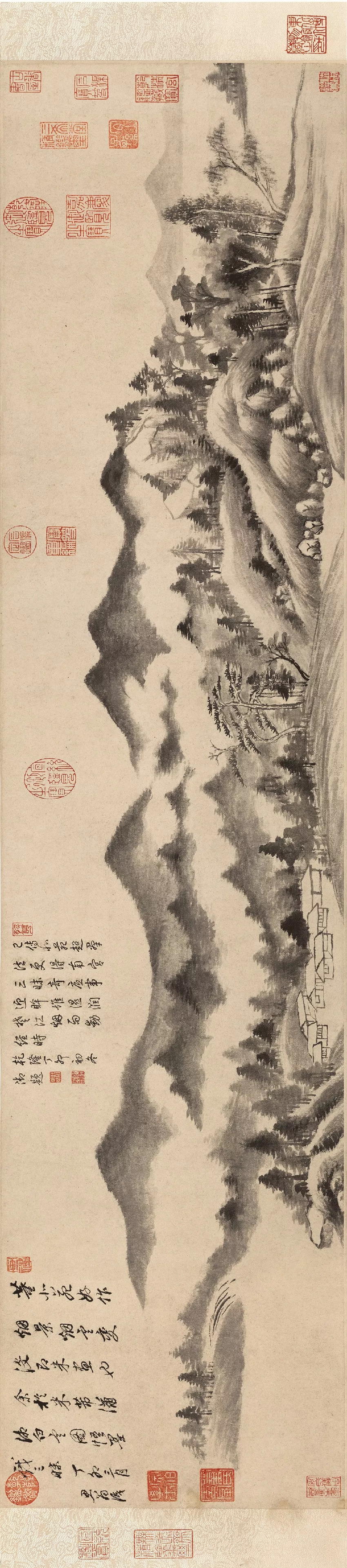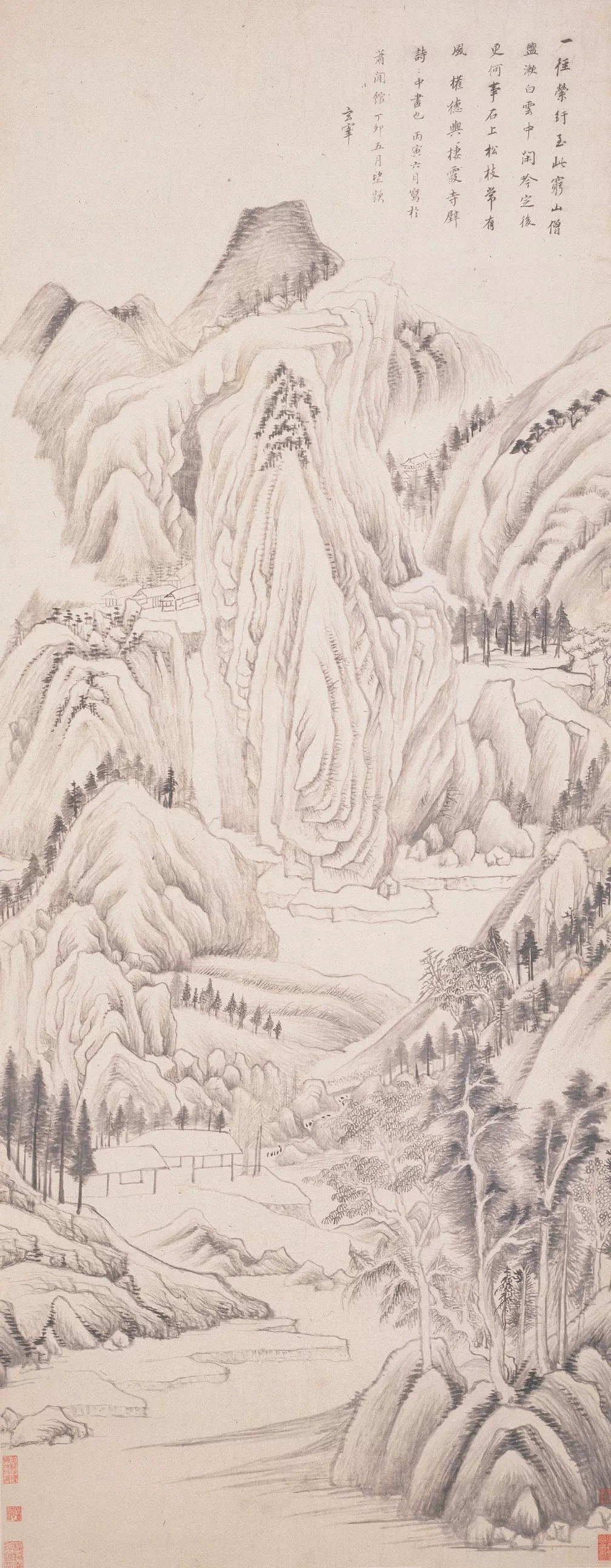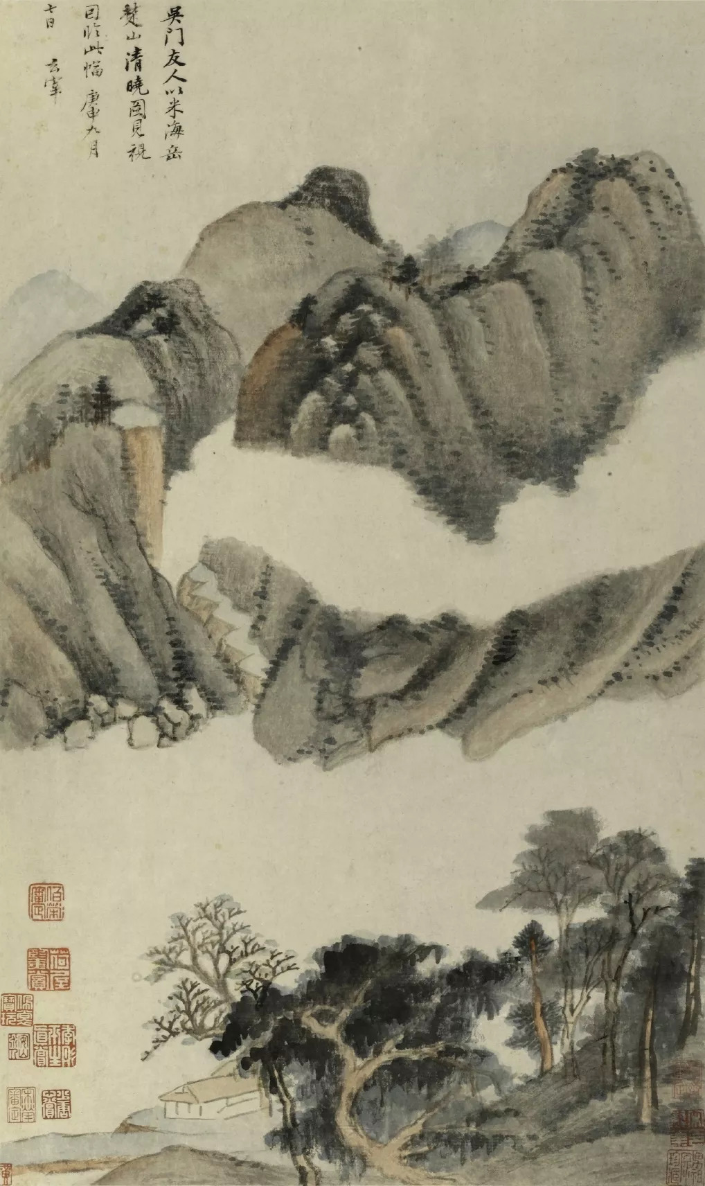 1635年,董其昌时年81岁,这是他观五代著名山水画家关仝所绘《关山雪霁》图后的临古之作。其实这幅临作并非雪景,只是采用关仝的画法而成。此图以平远和深远相结合的构图在一小卷内画连绵无际的山峦林壑,景物拥塞,然墨气鲜润,用笔苍劲生拙,物象历历分明,达到了密而不塞的艺术效果。作品笔墨苍浑深厚,又有饶富疏秀之致,兼具绚烂与平淡的旨趣,这便是董其昌欲触关仝绘画之机,遂为拟之的画意,其实也是他一生所追求的平淡天真的具体表现,因而他才自诩这幅佳作为「永日无俗子面目」。
