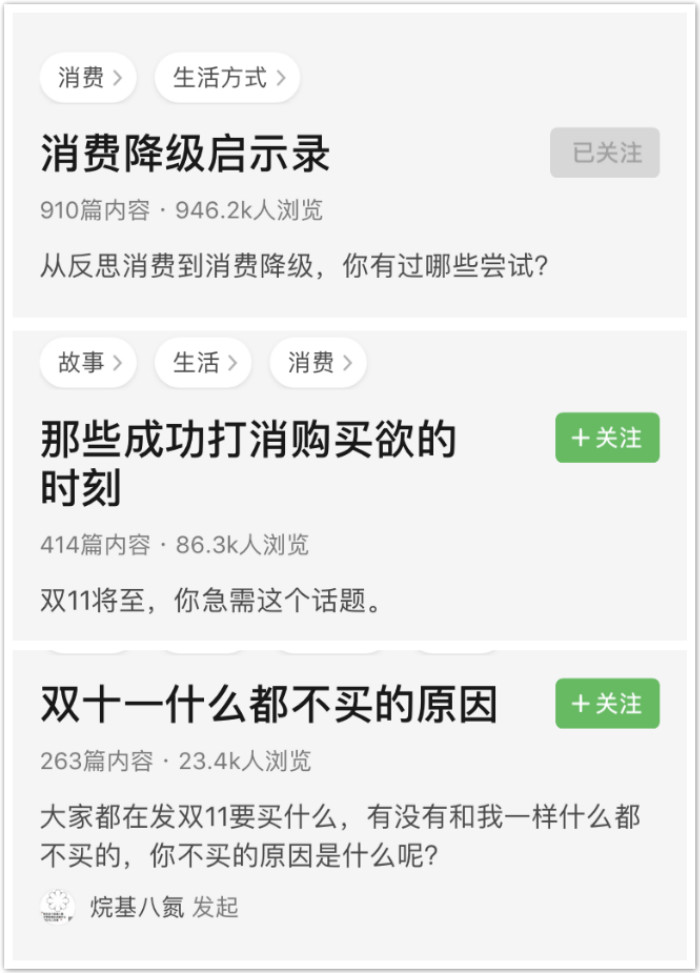 发起“双十一什么都不买的原因”话题的豆瓣网友“烷基八氮”统计网友回复发现,穷(26%)、没有需求(21%)和浪费时间/精力(8%)是“双十一”不购物的前三大理由。尽管这只是一个很小的消费者样本,但我们仍然能够从中一窥中国人消费心态的变化。特别值得注意的是“没有需求”这个原因,这意味着,部分中国消费者开始反抗消费主义“越多越好”的根本逻辑,主动选择一种“不为不必要的东西买单”的消费方式。