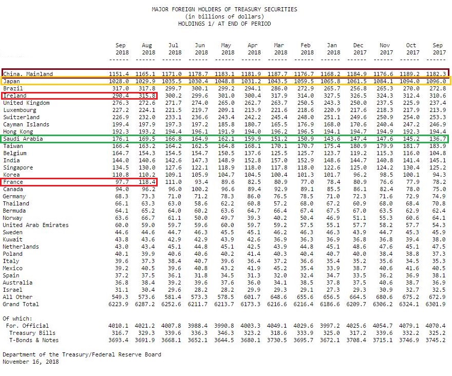 以下TIC截图展示了2017年9月至2018年9月主要国家地区每月持有美债规模,单位为10亿美元。