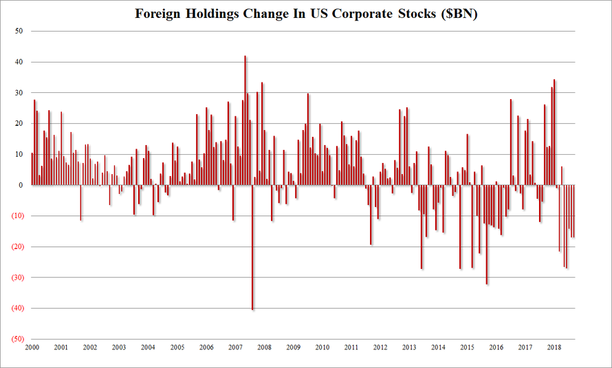 也许9月TIC报告最突出的一点是,9月海外投资者抛售美股169.8亿美元,为连续第五个月抛售。Zerohedge指出,这一美股抛售期为史上最长。海外官方和私人持有者过去五个月合计抛售美国证券1020亿美元,抛售规模也创新高。