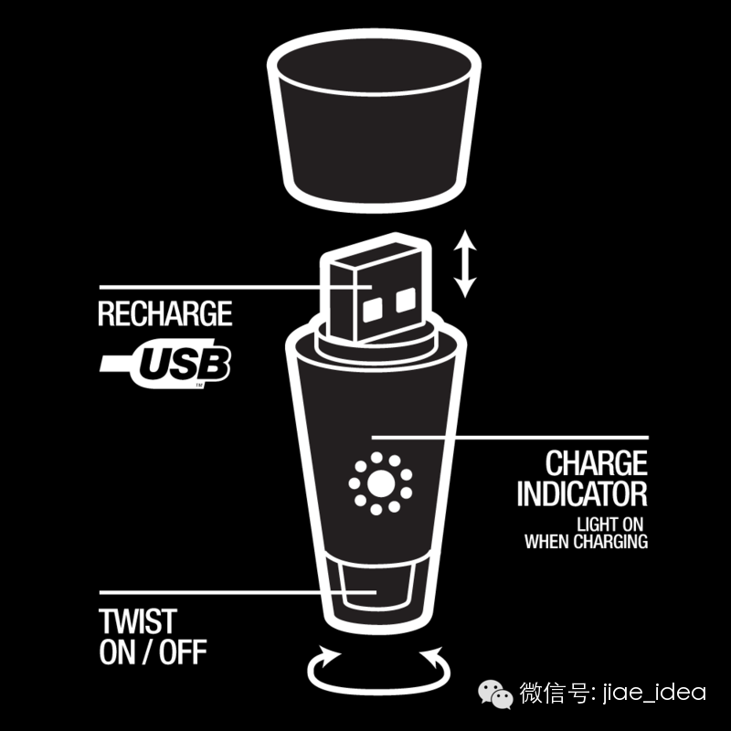 它的使用方法很简单:打开瓶塞,可以利用usb接口充电。旋转下方部分,即可实现灯的开关。