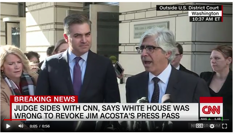 CNN在起诉书中表示,白宫方面的行为违反言论自由第一修正案,程序正义第五修正案以及联邦行政程序法(Administrative Procedure Act)。法官凯利在听取双方律师意见后两天做出裁定,判定被告白宫方面违反宪法程序正义原则。
