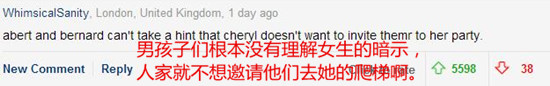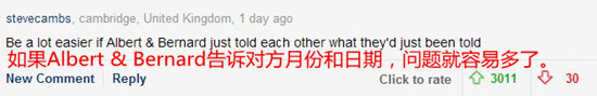 要说当日最佳,那一定是网友David Leong给出的答案:“Cheryl显然不想让Albert和Bernard这两个家伙参加她的生日派对。当Cheryl决定让他俩猜题时,他俩就该明白这姑娘的心思啊!”#认真你就输了#