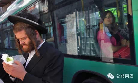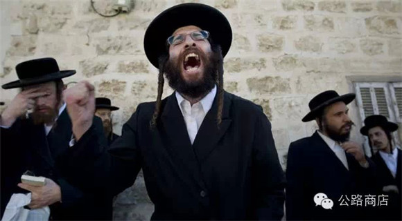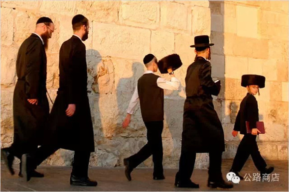 很守传统的犹太人常常穿着一身黑礼服,戴着黑礼帽,两鬓有长长的发绺,很多人是络腮胡子。