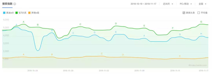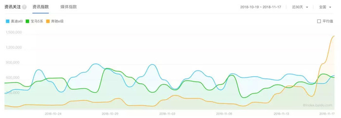 我们可以简单用百度指数来看看奥迪A6L的热度。理论上,在全新一代车型发布的加持下,奥迪A6L应该在搜索热度上超过5系和E级,可百度指数给出的结果是:在近30天内,宝马5系大幅领先奥迪A6L。