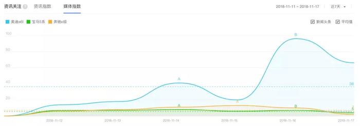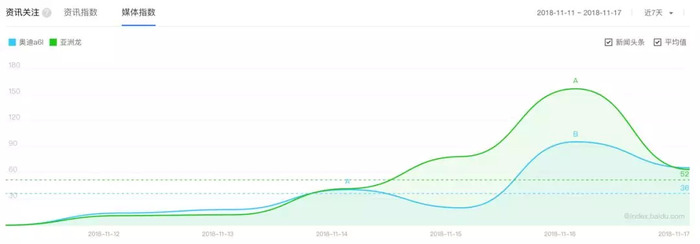 进一步再看看广州车展前后的媒体指数,奥迪A6L总算是抢过来奔驰、宝马的风头,有全新一代车型首发的声势。可是,转头我们再对比一下“奥迪A6L”和“亚洲龙”,前者在广州车展的热度几乎被后者碾压。可见,就连最喜欢德系豪华行政座驾的中国消费者,也没有对全新一代奥迪A6L产生太多的兴趣。